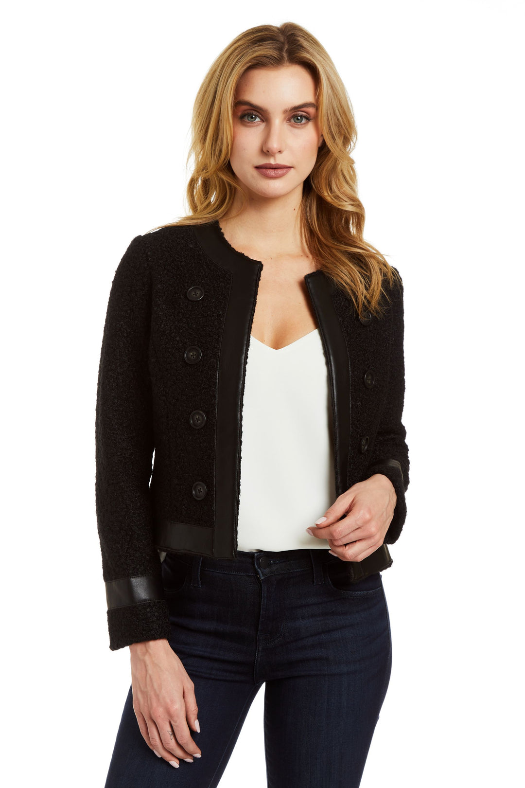 Everyone needs a little black jacket in their closet! Audrey is the one. She is classy and edgy, designed with a round neck, cropped body and made in boucle fabrication, and further elevated by faux leather buttons and trim.