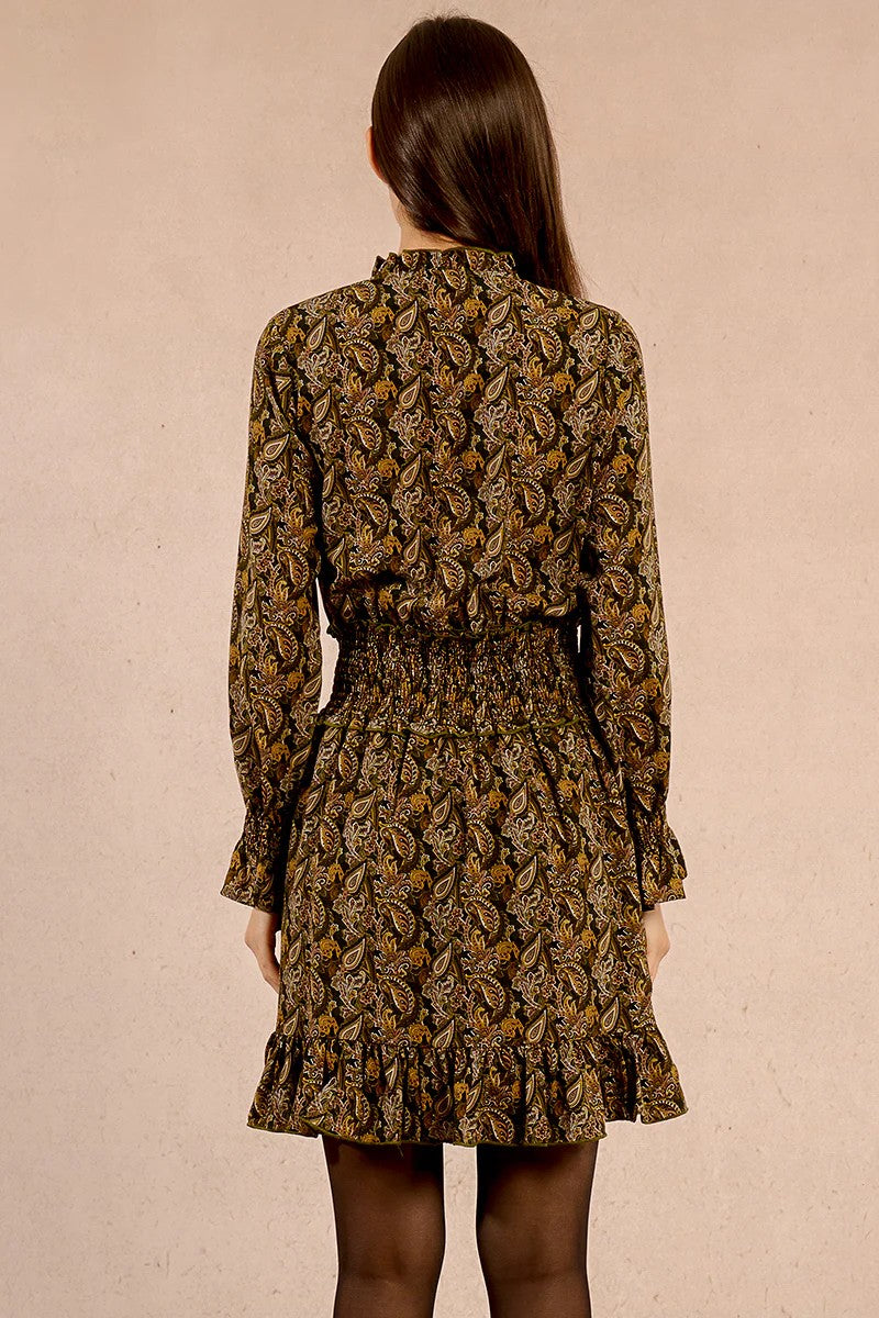 The Khaki Leia Dress blends effortless charm with subtle structure. Long balloon sleeves with smocked cuffs, an officer collar with a V-neckline and tie, and a wide smocked waist create a flattering silhouette, while a gentle ruffle at the hem adds movement and feminine detail.