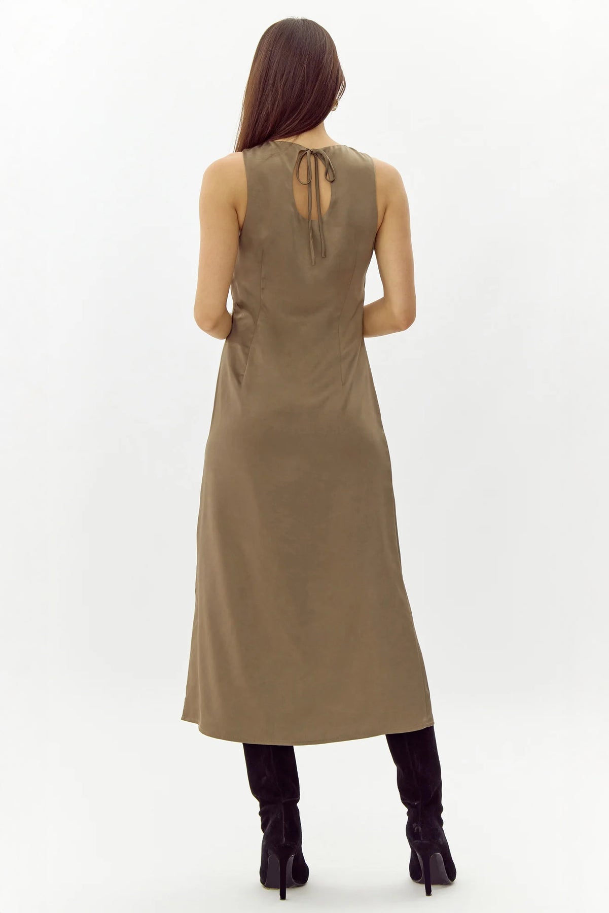 The Moss Green Trina Midi Dress is sleek and understated, with just the right amount of edge. Cut from a satin-like fabric that skims the body, it features a crew neckline, tie-back detail, and a side slit that moves with ease. The result: a timeless midi that feels equal parts effortless and refined.