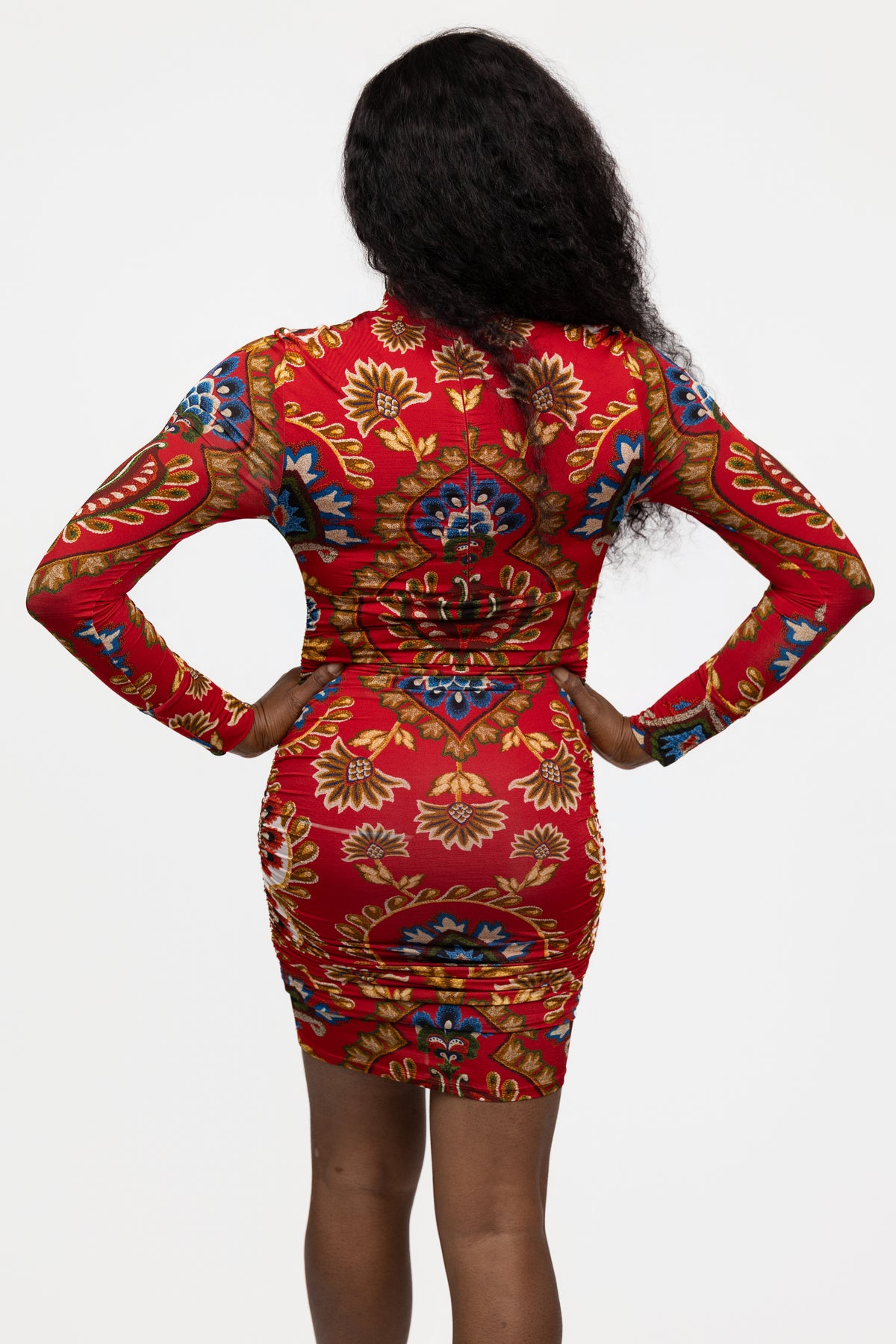 Bold, vibrant, and unapologetically you. This Red Folk Tapestry Mini Dress features a fitted silhouette with long sleeves and a high neckline for balance. The stretch rayon-blend fabric moves with you, keeping comfort and confidence in perfect sync.