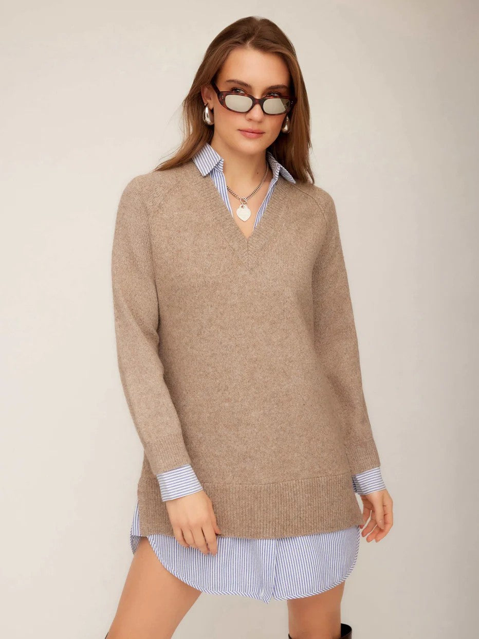 The Wheat Mixed Media Carrie Dress pairs a classic collared shirt-dress base with a soft sweater overlay for a modern layered effect. Finished with a V-neckline, raglan sleeves, ribbed trims, buttoned cuffs, and a subtle shirttail hem that peeks beneath the sweater, it offers a relaxed fit that balances polish with ease.