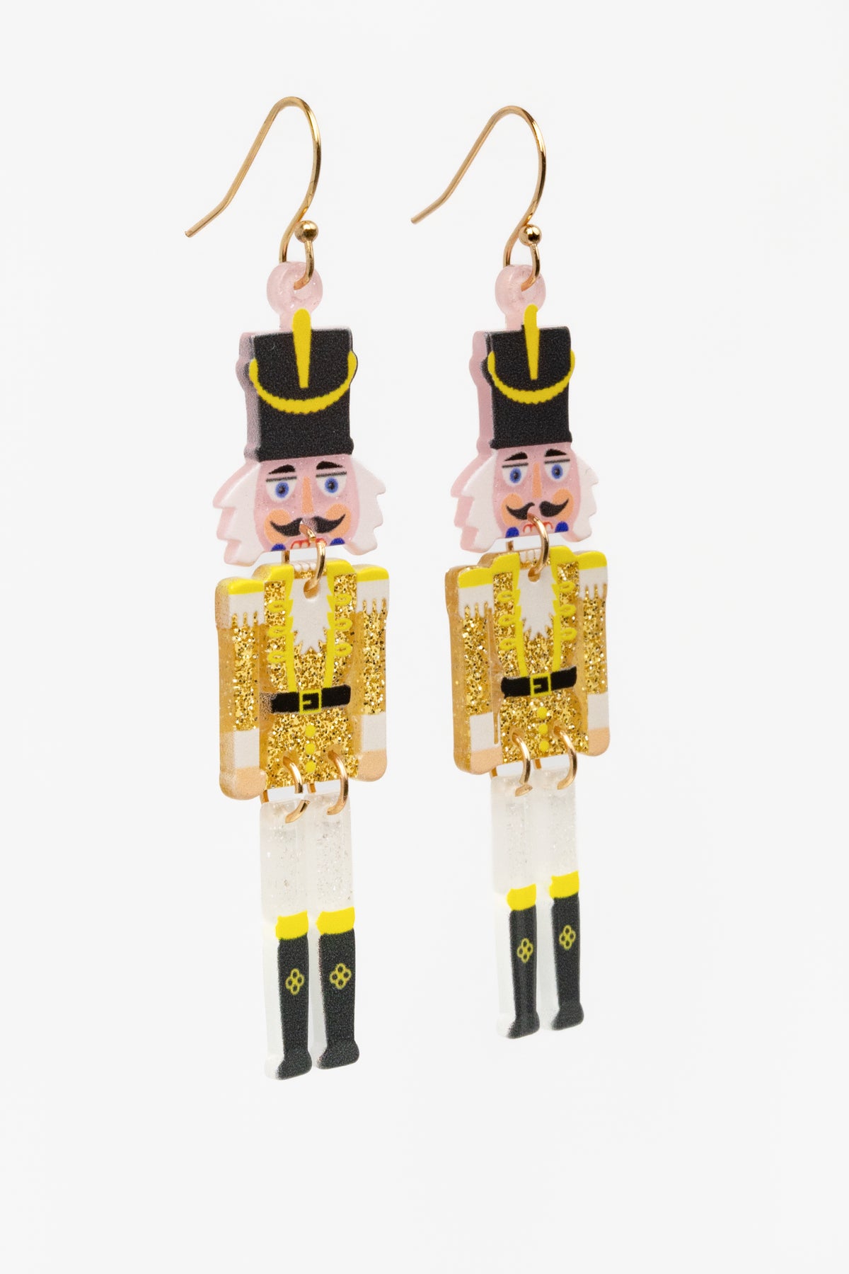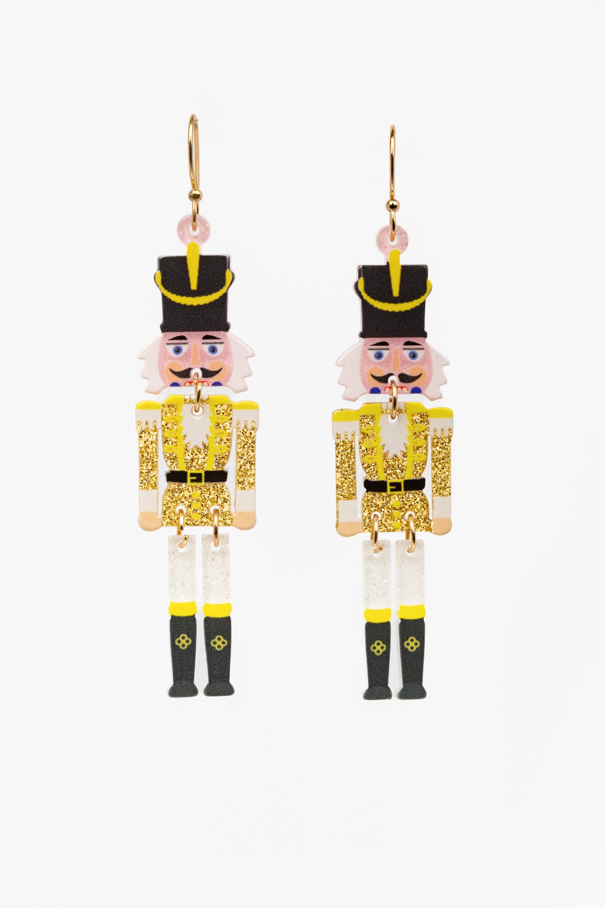 The Gold Multi Nutcracker Dangle Earrings bring classic holiday nostalgia with detailed nutcracker charms and colorful accents. A whimsical statement piece made for festive gatherings and seasonal celebrations.