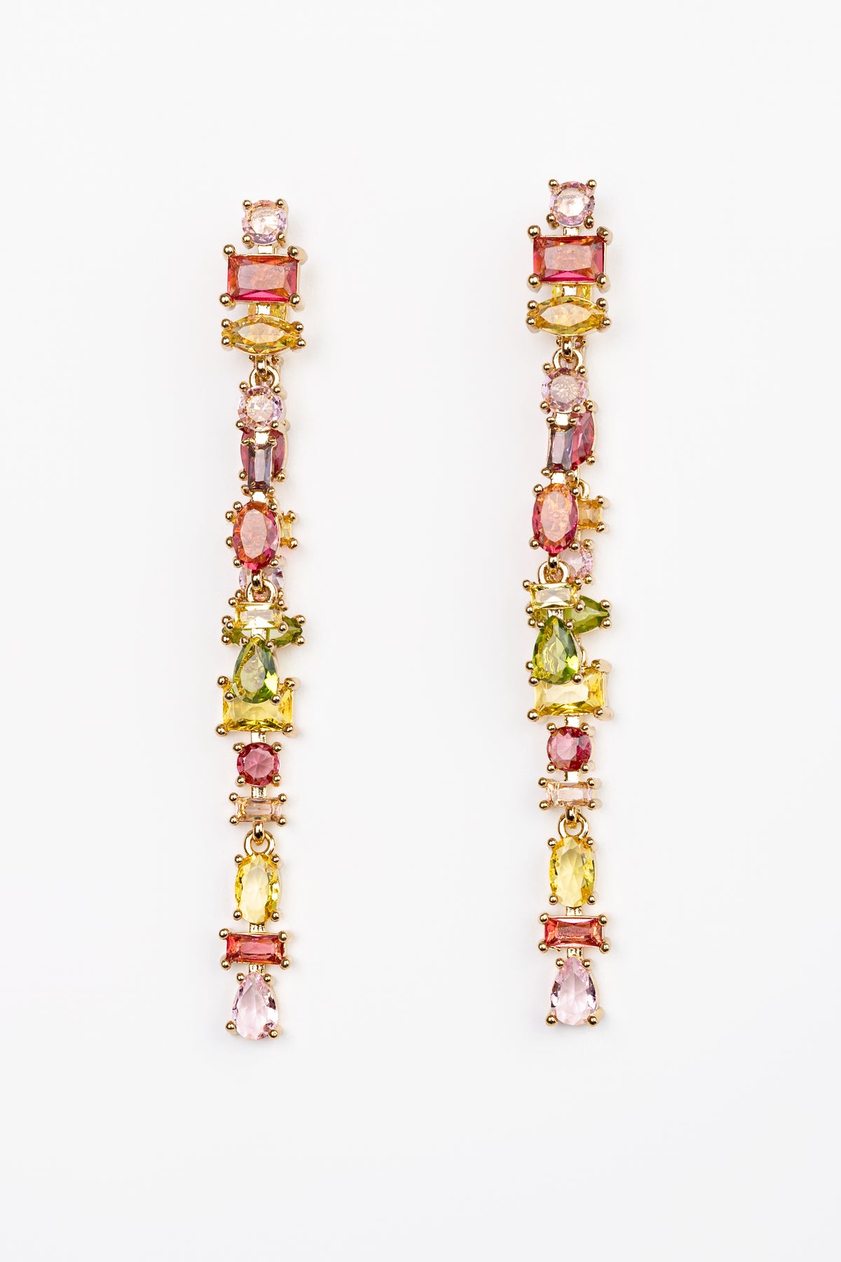 The Jewel Toned Crystal Drop Earrings bring bold color and sparkle with layered duster strands adorned in jewel-toned rhinestones. Pink, olive green, purple, and yellow stones catch the light in every direction, creating a vibrant yet sophisticated look perfect for fall and holiday. Lightweight and three inches long, they’re statement-makers that still feel effortless.
