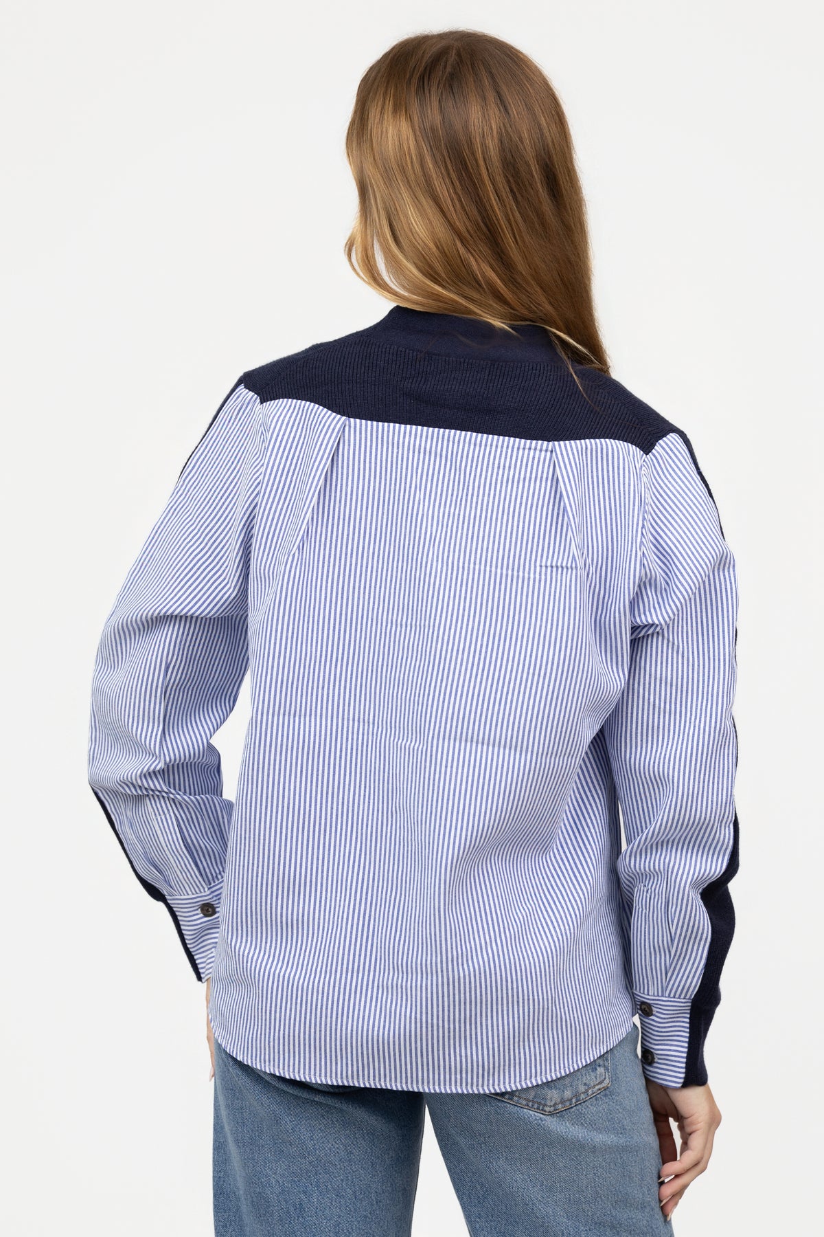 The Navy Mixed Media Celine Cardigan contrasts soft knit texture with crisp woven shirting for a modern layered effect. Finished with a deep V-neckline, tortoiseshell-effect buttons, and double-button shirt cuffs, it drapes with a relaxed fit and an elongated shirttail hem that pairs seamlessly with denim or trousers.