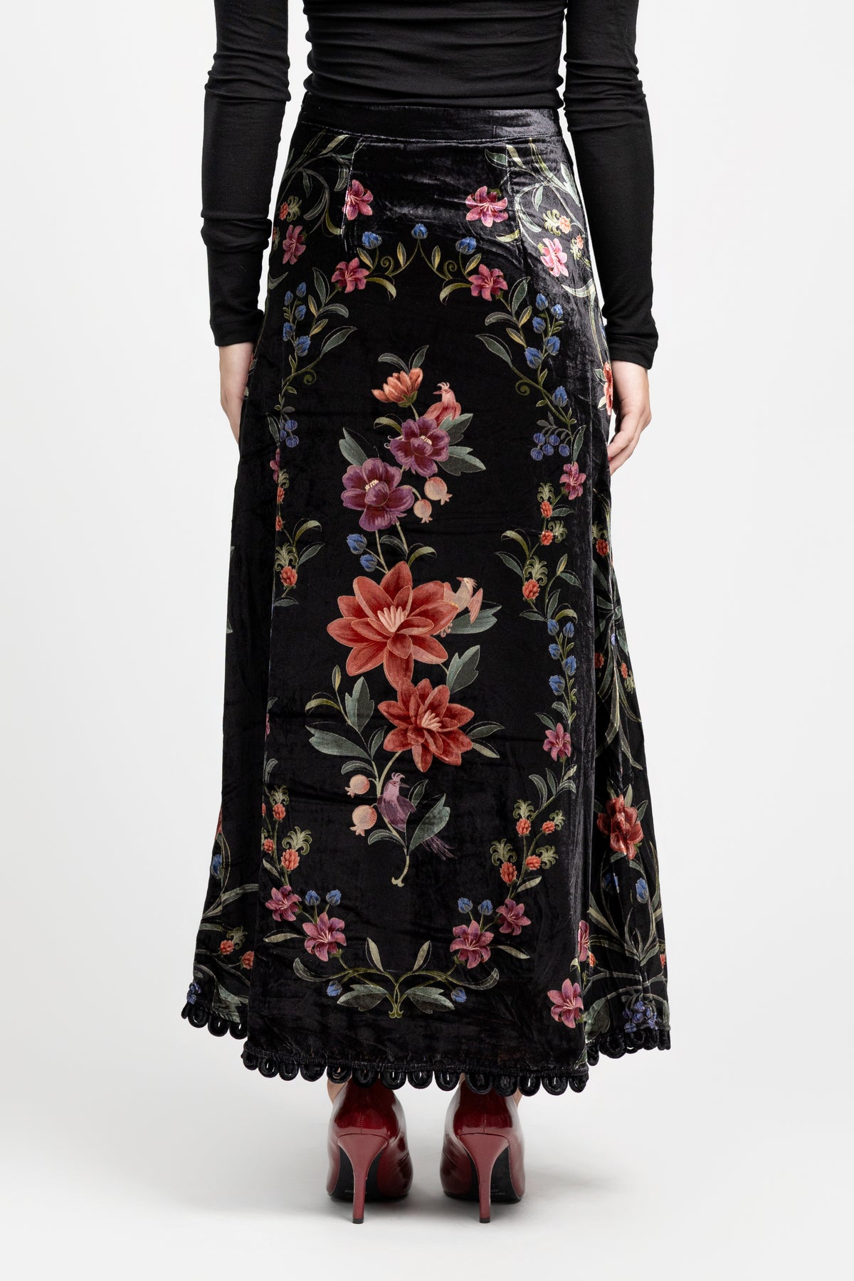 The Black Belle Garden Midi Skirt enchants with its lush black velvet base scattered in painterly florals. A scalloped hem lends soft texture and whimsy to the flowing midi length, creating a look that’s equal parts romantic and refined.