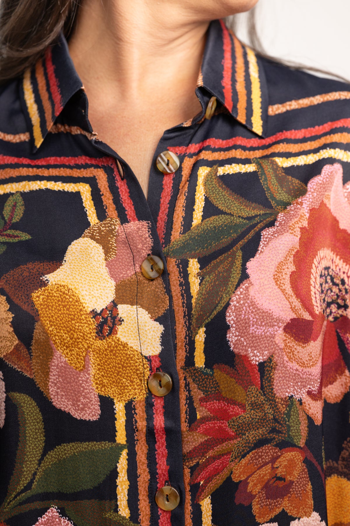 The Black Chenille Flowers Shirt blooms with bold embroidery in warm reds, pinks, and ochres across eco-conscious Lenzing Ecovero viscose. Its relaxed silhouette, adorned with a classic collar neckline, flows effortlessly, while the rich chenille details add a tactile depth that invites touch. A vibrant celebration of nature’s beauty, this top is designed to inspire joyful moments every day.
