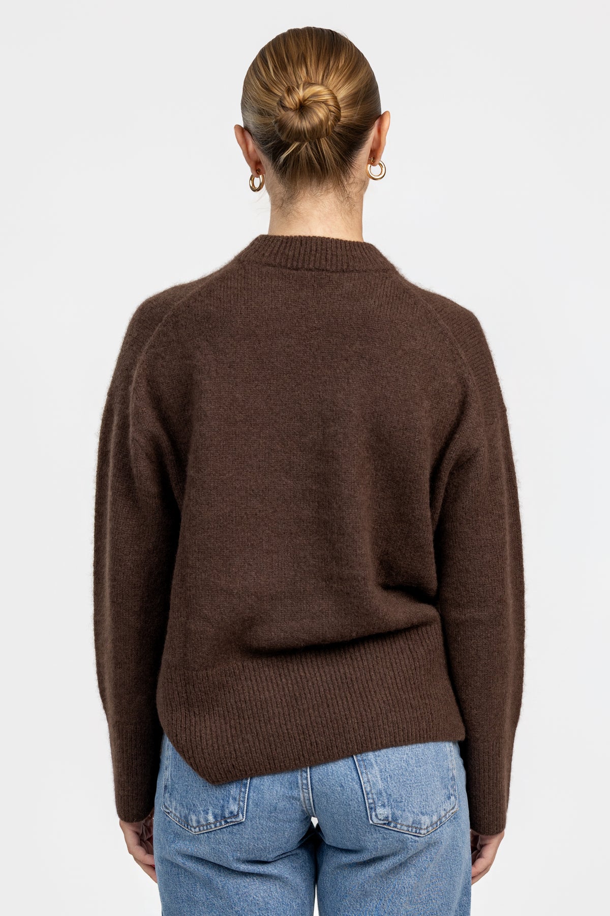 The Chocolate Miranda Sweater is crafted from a luxurious cashmere-silk blend, offering unmatched softness with the strength to last season after season. Its versatile design moves seamlessly from day to night—pair it with a satin skirt for an elevated look or with denim for effortless everyday style.
