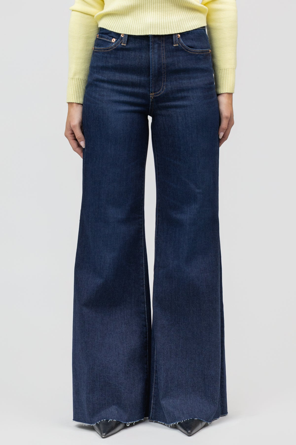 The Tristesse High Rise Izzy Jean brings structure and ease together in one bold silhouette. With a slim top block that opens into an exaggerated wide leg and a subtle kick flare at the hem, it balances polish and attitude effortlessly. The raw hem gives it just the right amount of edge—refined, but never too serious.