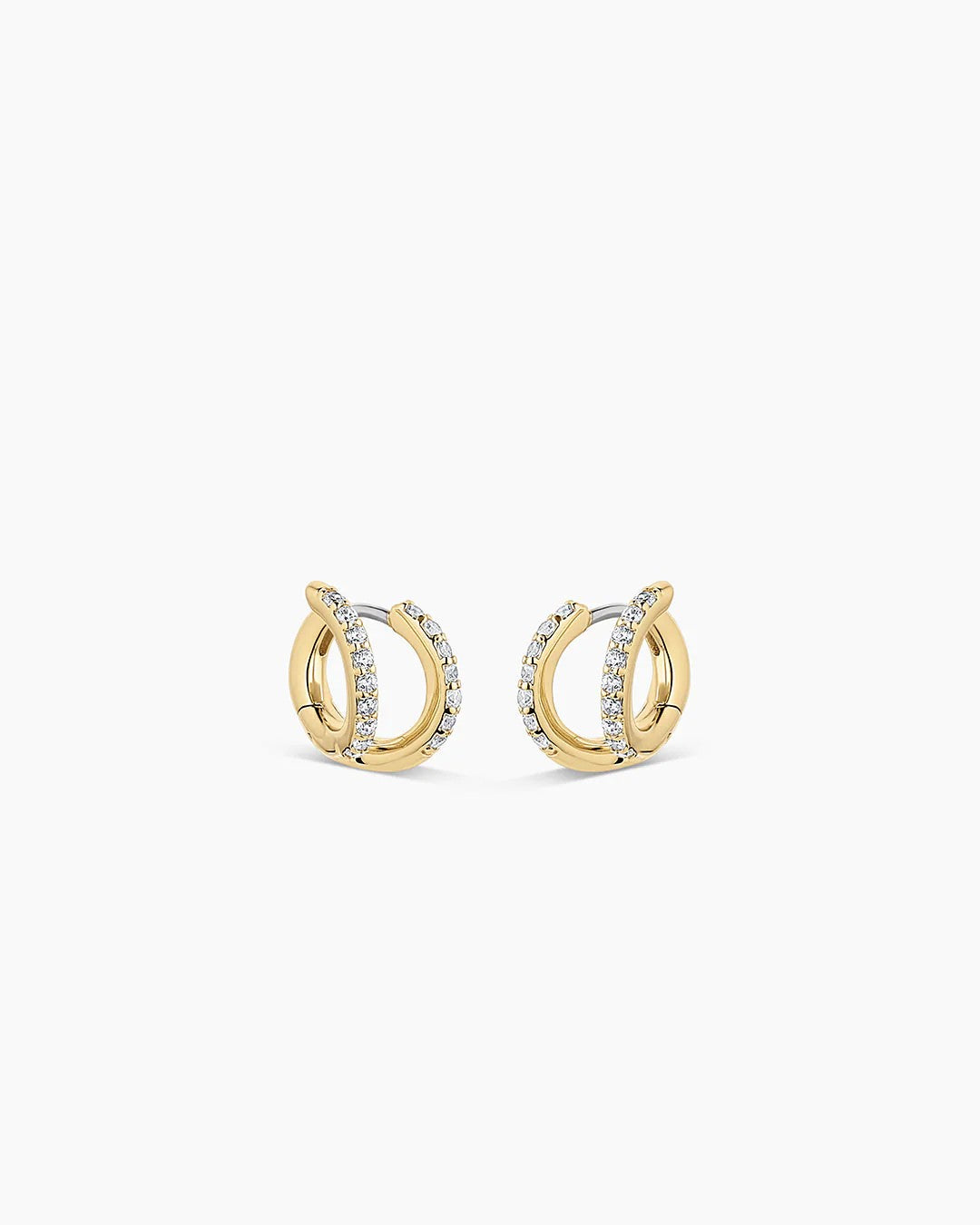 The Gold Shimmer Double Huggies bring instant dimension to your ear stack. Crafted from polished 18k gold-plated brass and accented with white CZ stones, these hoops give the illusion of multiple piercings in one sleek design. Lightweight and versatile, they add a subtle shimmer that’s perfect for everyday wear.