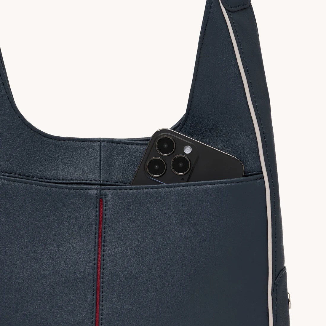 The Navy Tim Medium Handbag is a women’s hobo-style shoulder bag designed with a soft structure and elongated silhouette. Crafted from grey-leaning navy pebble leather with sapphire undertones and white piping detail, it features a fixed shoulder strap, magnetic top closure, and signature hardware accents.