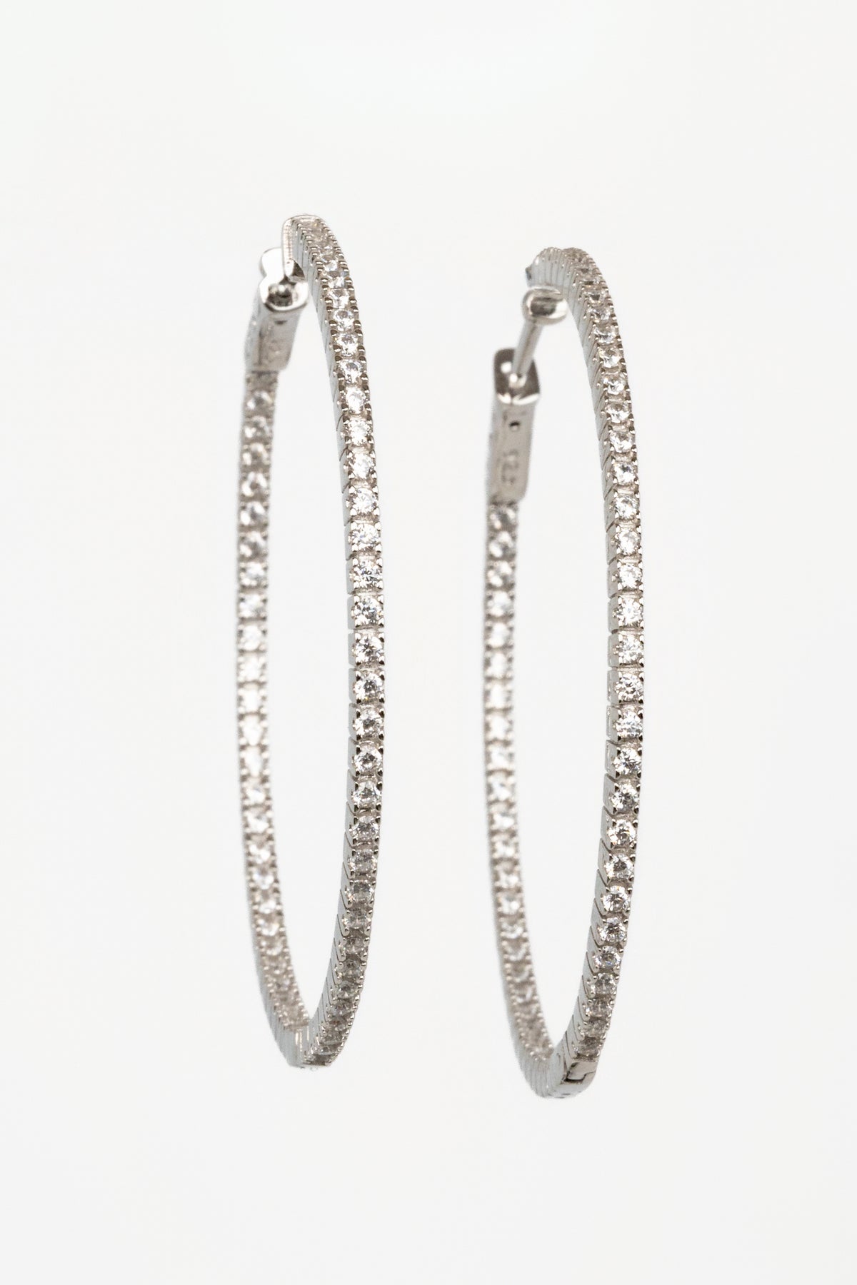 The Silver Inside Out Hoop Earrings bring a clean, modern shine in a classic size. Crafted from sterling silver, each 1" hoop is set with a single row of CZ stones along the inner and outer edges for a subtle, continuous sparkle.