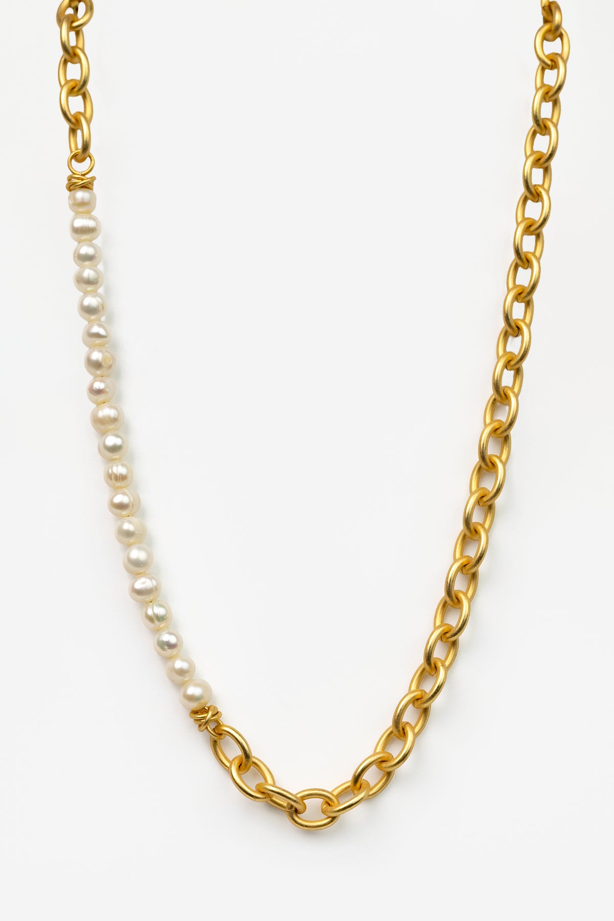 The Gold Lenny Necklace balances edge and elegance with its thick link chain and a strand of wire-wrapped pearls. The mix of structure and softness gives it a modern, elevated feel—easy to layer, striking on its own.