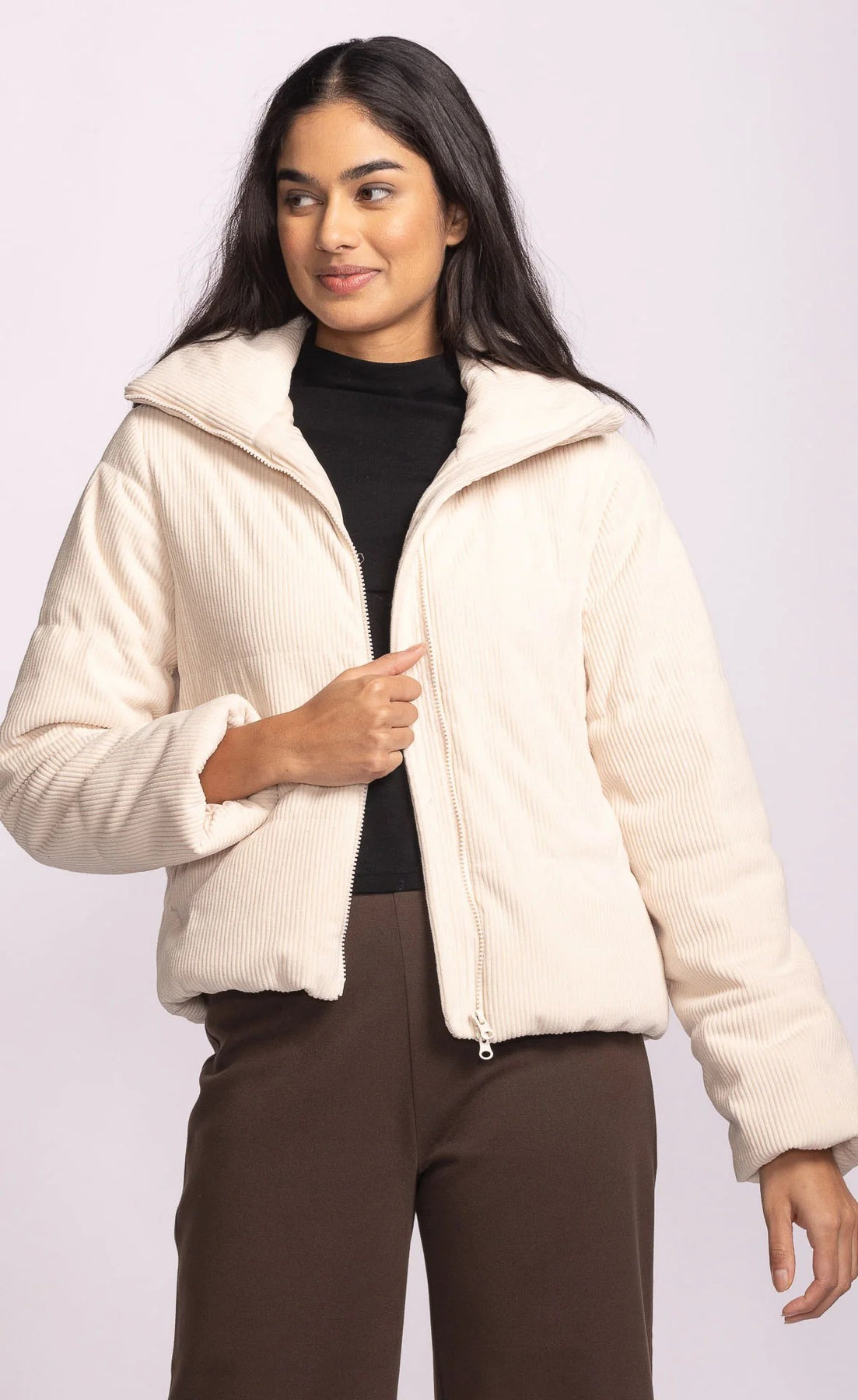 The Beige Northfield Jacket is a lightweight puffer with a soft corduroy finish, designed for effortless layering as the seasons shift. Its high neckline, zip closure, and welt pockets blend cozy comfort with modern polish, making it a versatile piece for everyday wear.