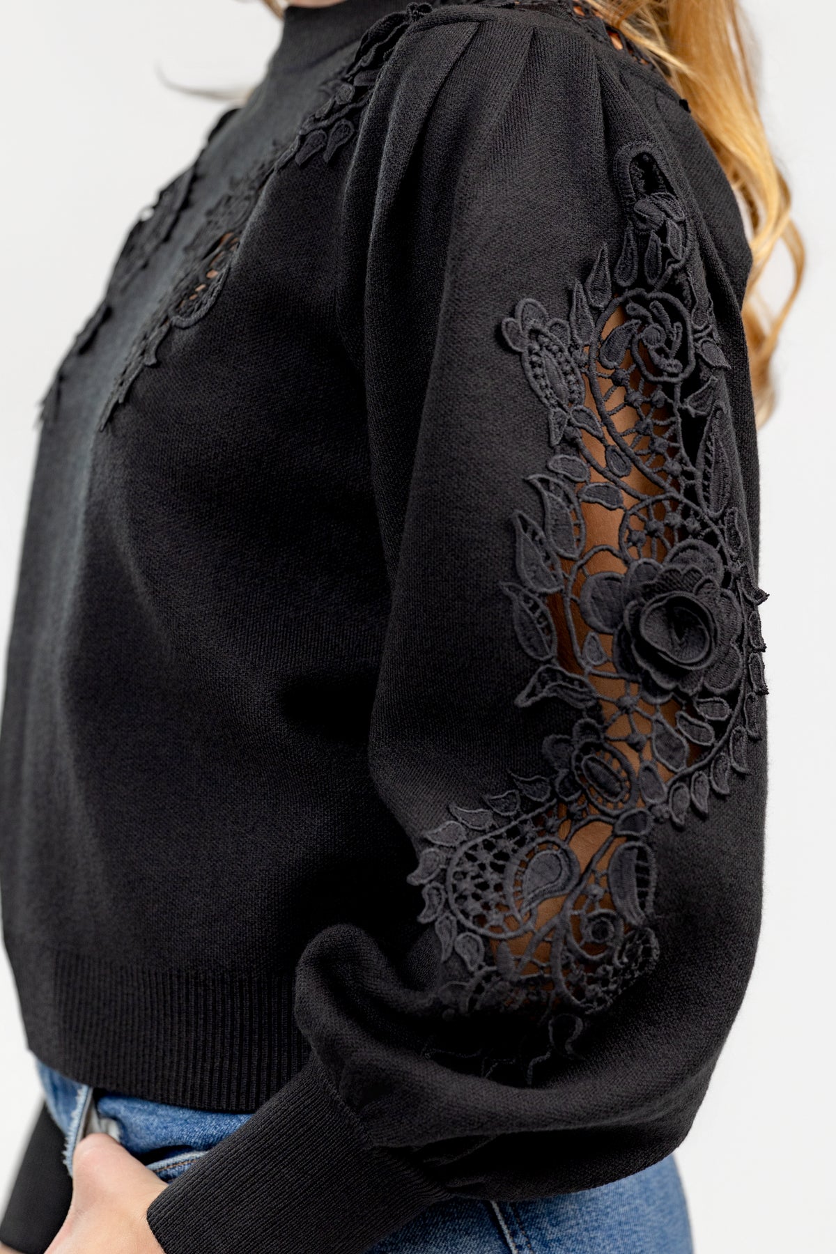 The Black Lace Knit Sweater blends delicate romance with effortless wearability. Dimensional floral lace appliqués frame the yoke and balloon sleeves, adding subtle texture and interest to a classic crewneck silhouette.