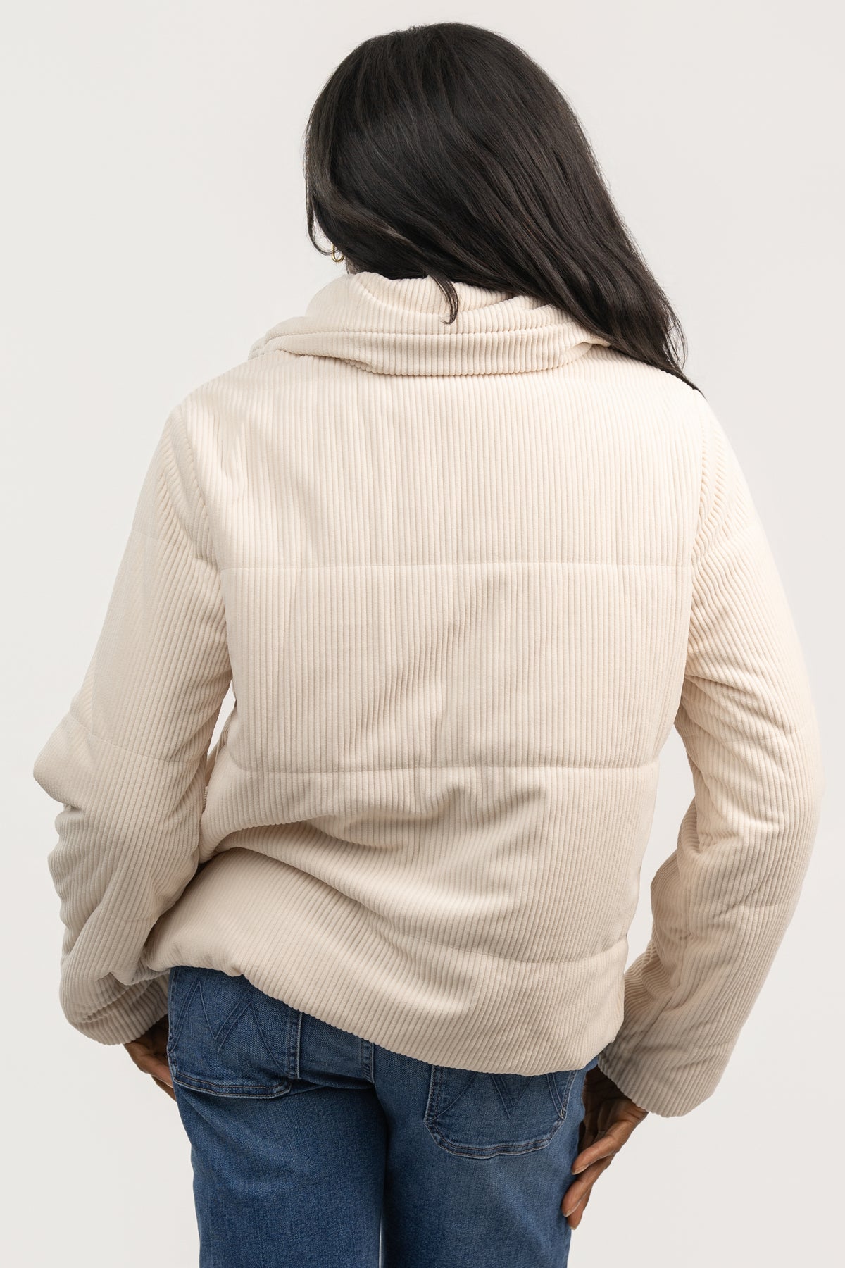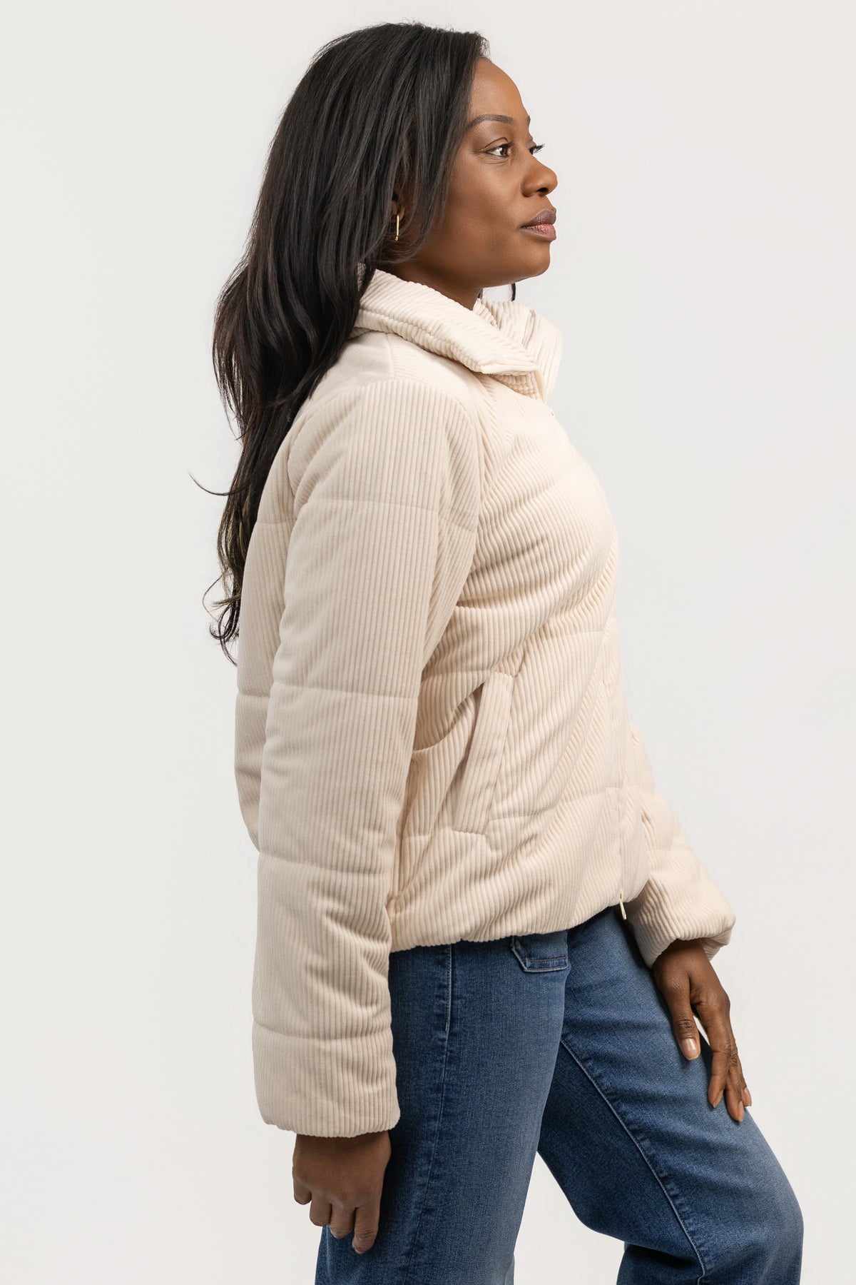 The Beige Northfield Jacket is a lightweight puffer with a soft corduroy finish, designed for effortless layering as the seasons shift. Its high neckline, zip closure, and welt pockets blend cozy comfort with modern polish, making it a versatile piece for everyday wear.