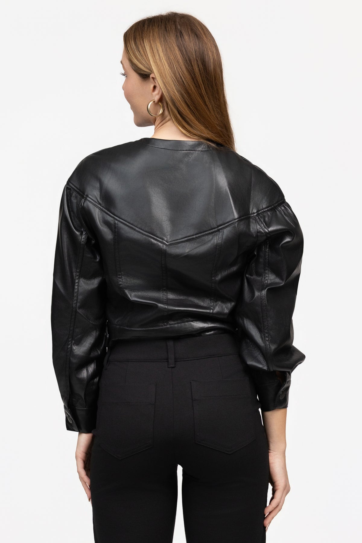 The Black Sabrina Jacket is cut from sleek vegan leather with a structured, cropped silhouette and softly gathered shoulders. Banded hem and full-length sleeves add subtle definition, while a snap-front closure and collarless neckline keep it modern and versatile—perfect for layering with everything from dresses to denim.
