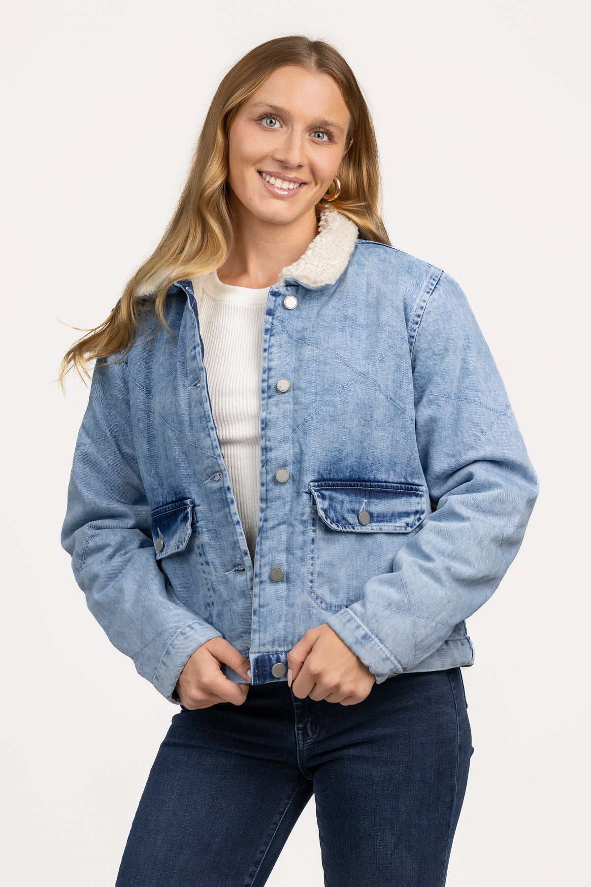 The Light Indigo Denim Sherpa Jacket pairs classic trucker lines with cozy sherpa lining. Light indigo wash and dark copper hardware give it a subtle vintage edge, while quilted sleeves and side pockets make it as functional as it is timeless.
