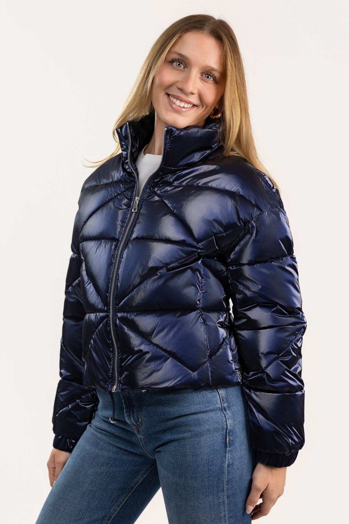 The Midnight Blue Padded Jacket is the kind of layer you reach for when warmth meets style. Quilted with soft insulation and crafted in subtly iridescent fabric, it features a stand-up collar, long sleeves with elasticated cuffs, and a cinchable waist for a tailored, flattering fit. Fully lined and polished in every detail, it’s a modern essential for crisp days.