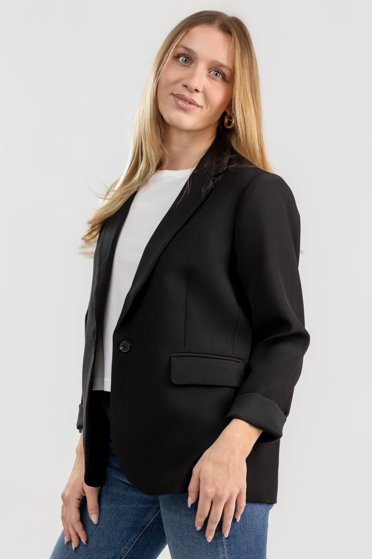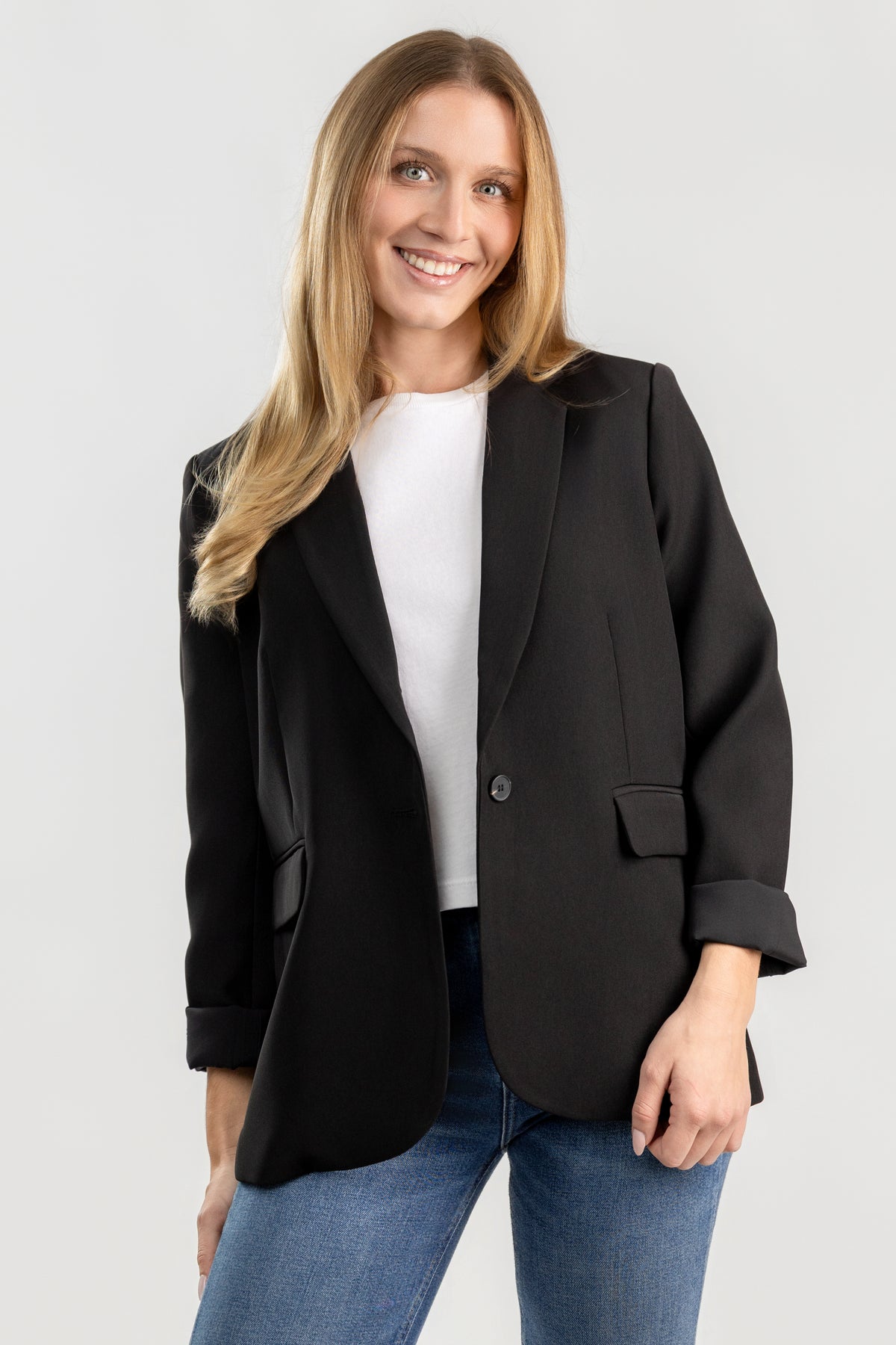 The Black Woven Blazer brings understated polish to any wardrobe. Its clean, straight silhouette is framed by a wide tailored collar and long sleeves, while the subtle flap pockets and button closure maintain refined, effortless structure. Designed with a modern cut that balances sharp tailoring and relaxed ease, it’s a versatile layer for both workdays and evenings out.