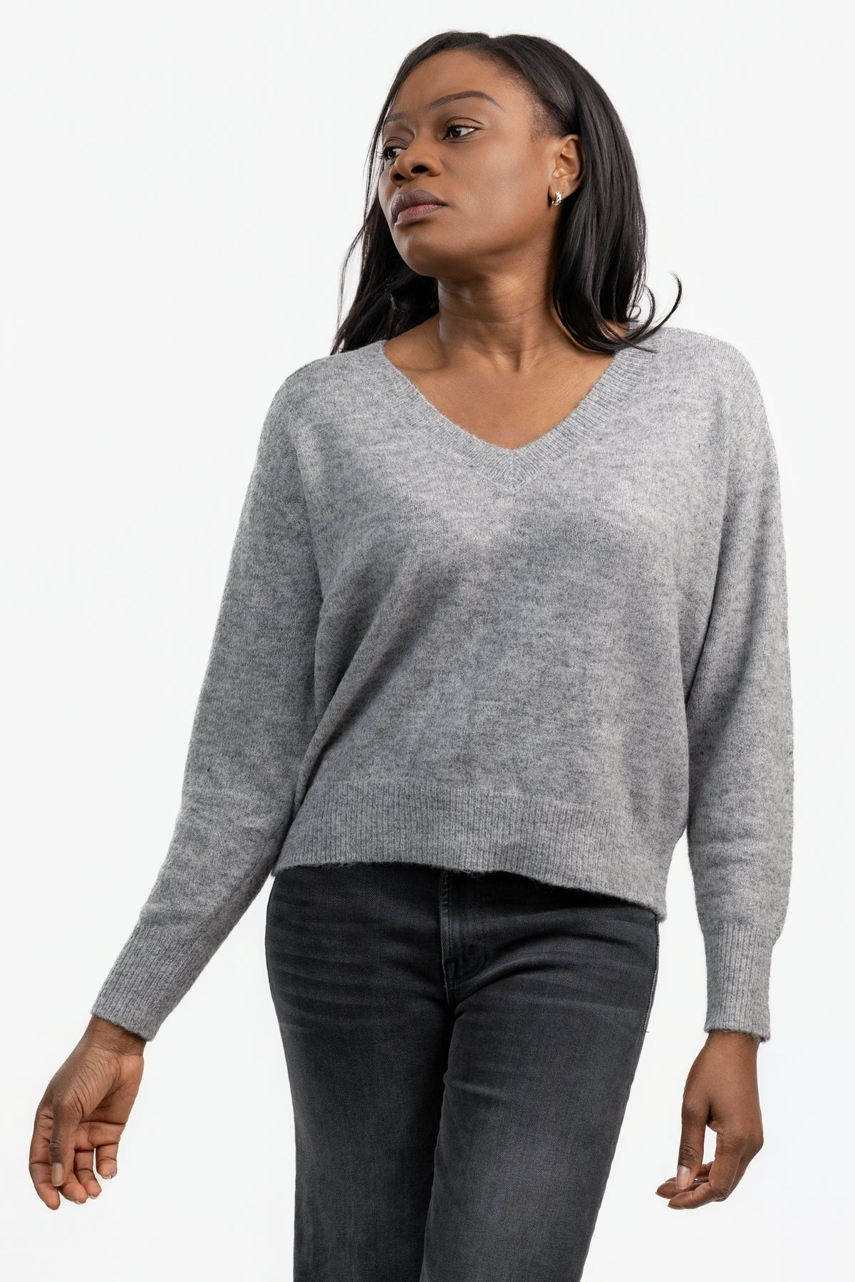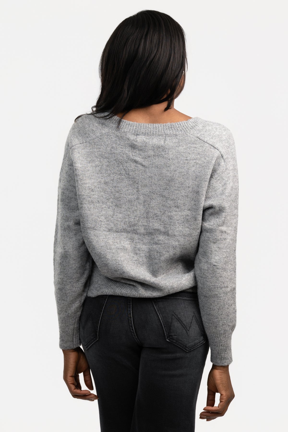 The Grey Jacon Sweater is a V-neck knit with ribbed trims and a relaxed silhouette. Soft, versatile, and easy to wear, it’s a modern essential that layers effortlessly or stands alone as a polished everyday piece.