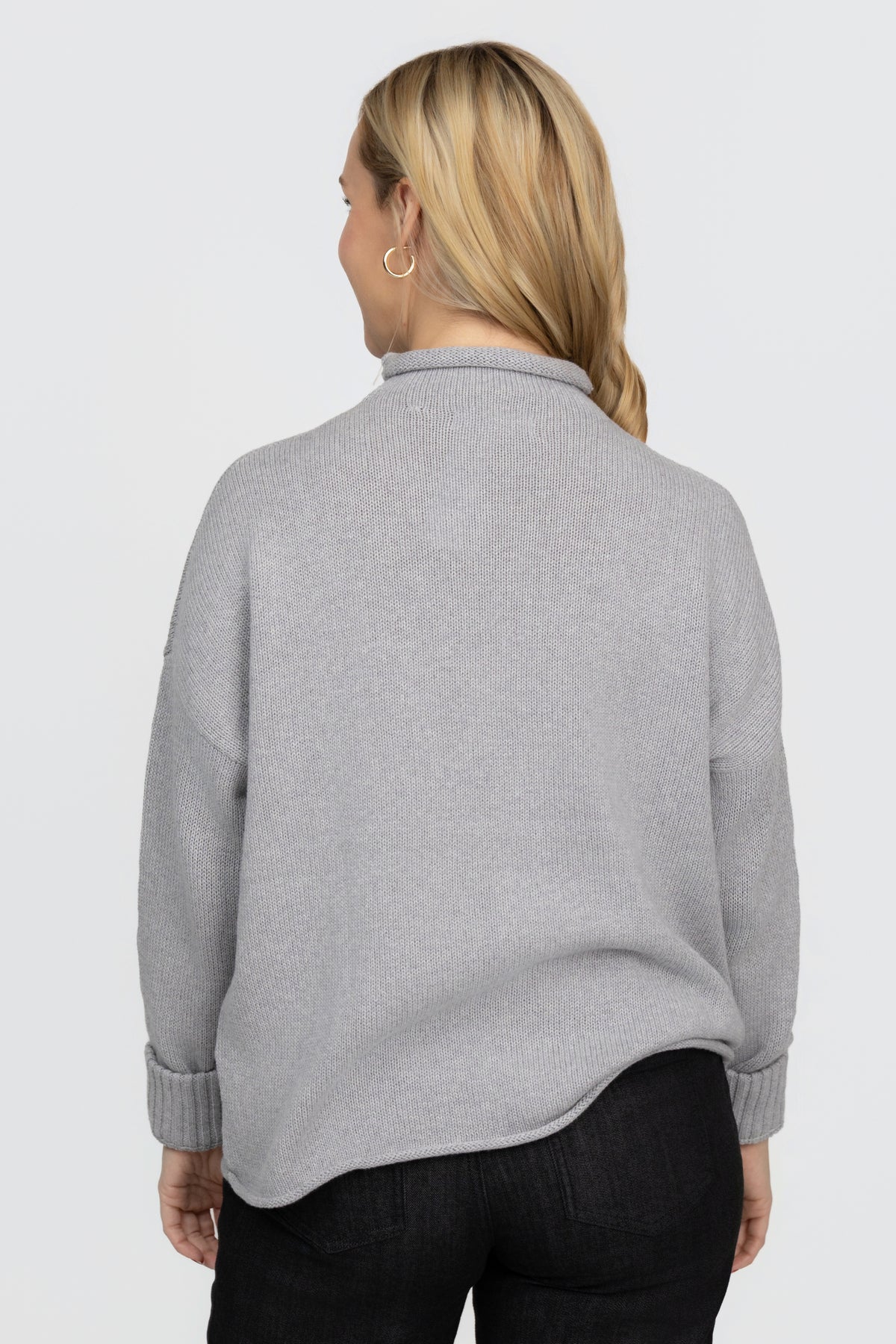 The Heather Grey Nova Sweater blends comfort and polish in a soft cotton-cashmere knit. Designed with a roll neckline that feels modern and light, it offers warmth without bulk. The full-length, regular fit hits at the hip, creating a clean silhouette that layers effortlessly through the season.