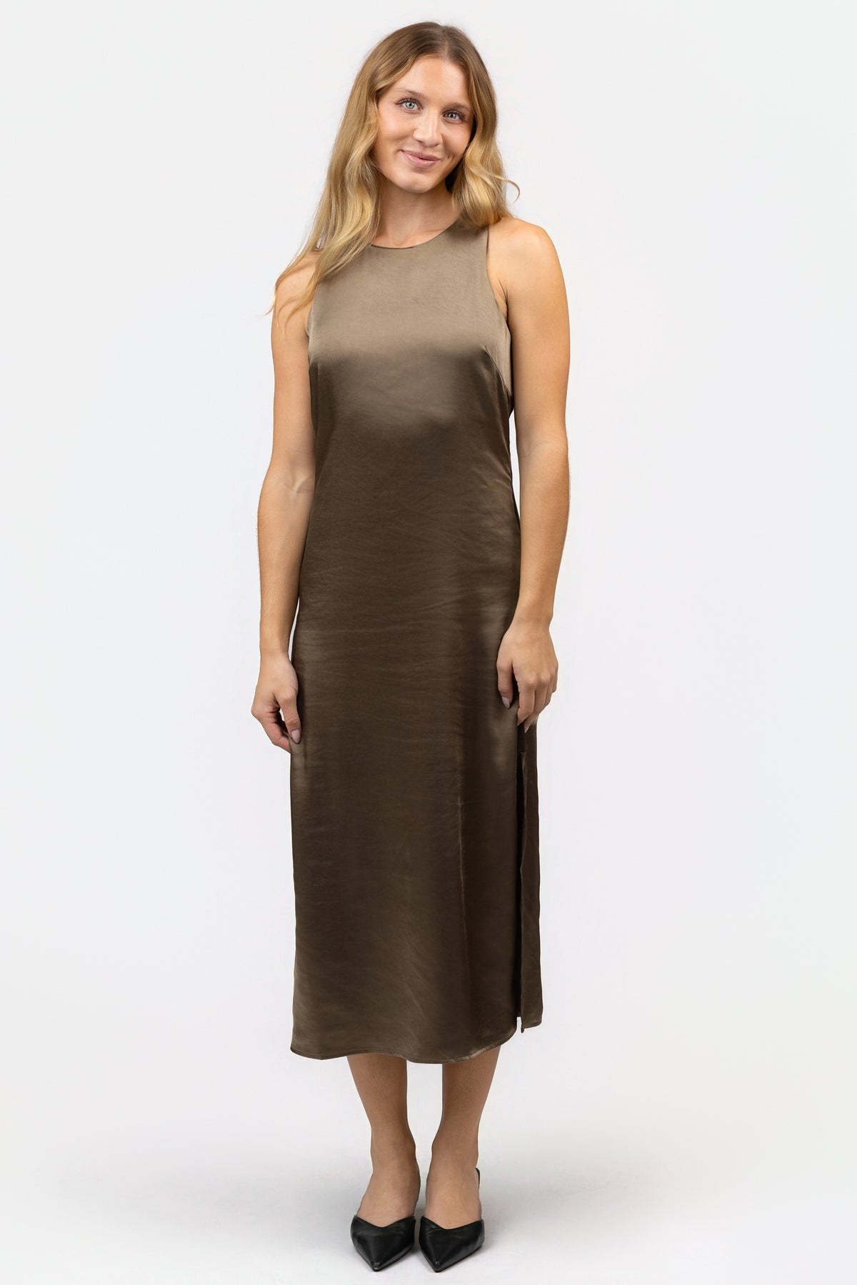 The Moss Green Trina Midi Dress is sleek and understated, with just the right amount of edge. Cut from a satin-like fabric that skims the body, it features a crew neckline, tie-back detail, and a side slit that moves with ease. The result: a timeless midi that feels equal parts effortless and refined.
