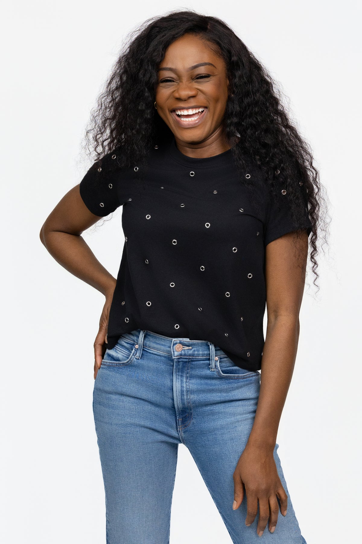The Faded Black Embellished Tee brings subtle edge to an everyday essential. Made from 100% organic cotton, it features a washed black finish and tonal grommet detailing for texture and attitude. Soft, breathable, and easy to wear—an elevated take on a classic crewneck tee.